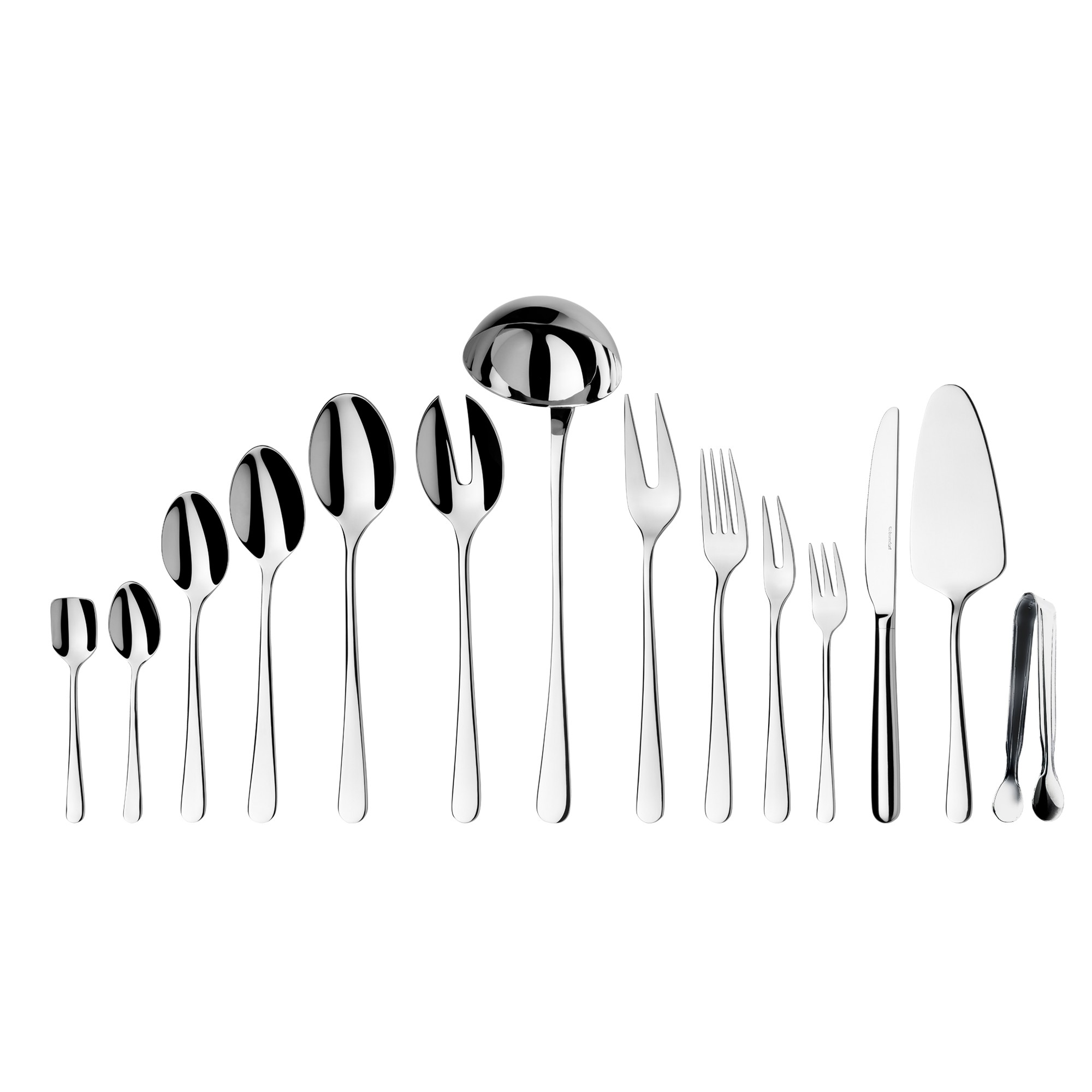 12x table spoon (209mm), 12x table fork (209mm), 12x table knife (230mm), 1x cream spoon (184mm), 12x dessert fork (155mm), 12x coffee spoon (136mm), 1x soup ladle (295mm), 1x prep fork (240mm), 2x salad spoon (242mm), 1x salad fork (240mm), 1x cake scoop (247mm), 1x fork for cutting (185mm), 1x sugar/ice cream spoon (126mm), 1x sugar tongs (110mm).